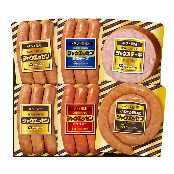 ギフト限定)シャウエッセン100g×2個、 シャウエッセン濃厚チーズ100g、 シャウエッセンチョリソー100g、 ぐるぐる巻いたシャウエッセン122g シャウステーキ122g